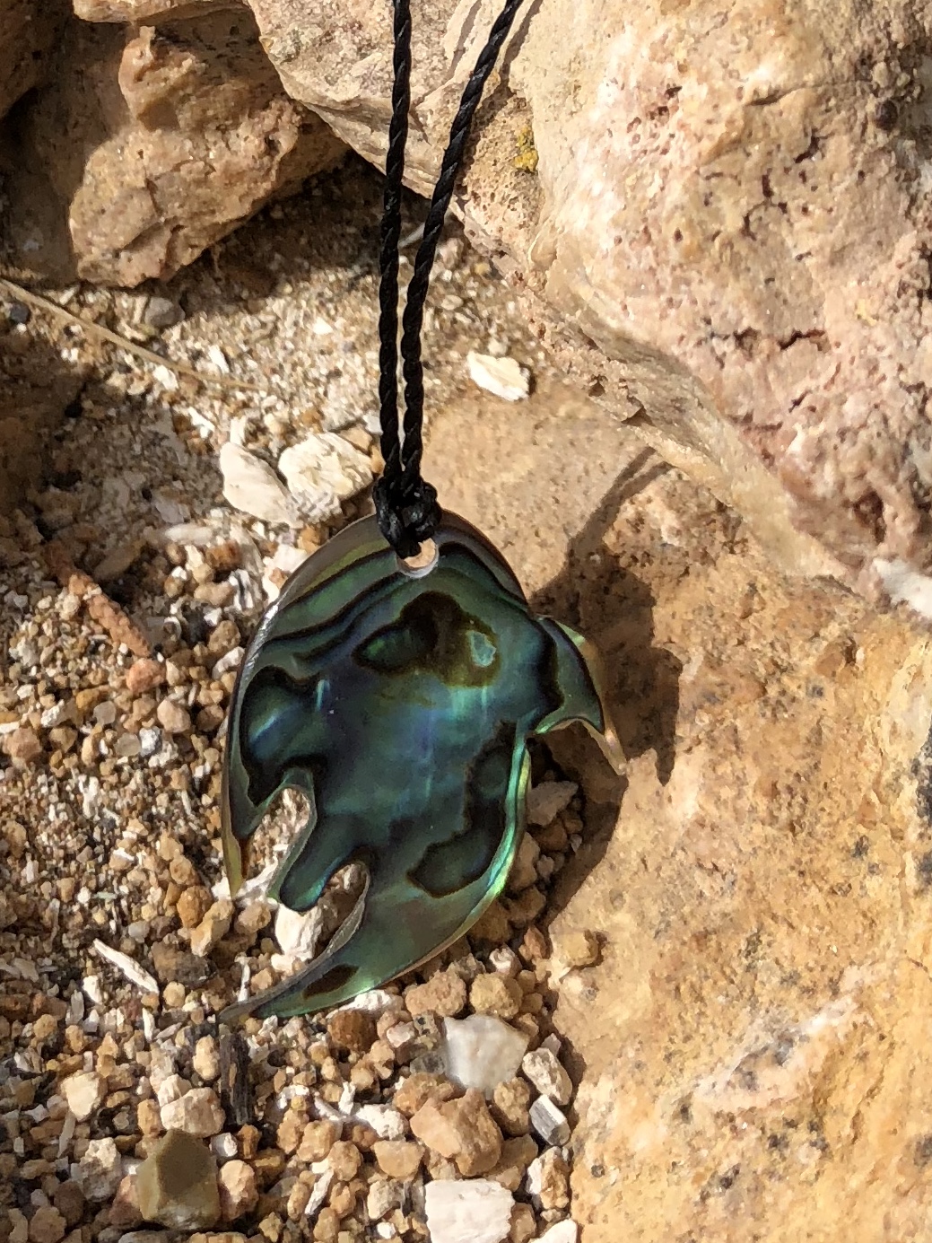 The Raven Dance Pendant can be ordered in black pearl, white bone or golden pearl.